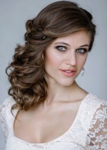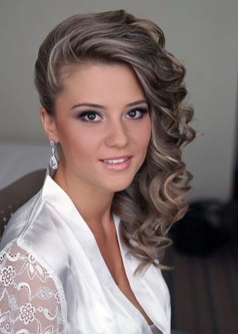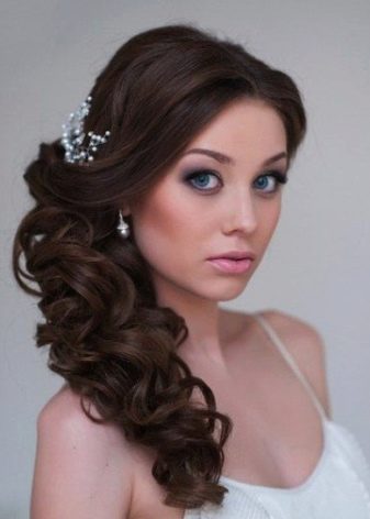 Curled hairstyles, removed to the side, are amazingly “worn” on strands of different lengths. For example, on medium hair, such a solution will look incomparable if you “support” it with medium strands, gathered in a bun, or French braiding. If we are talking about a spectacular wedding hairstyle, then it is better not to forget about the use of suitable accessories and jewelry. Especially attractive in such an environment are pearl beads and decorative stilettos. Expressive details can become strands of pearls.