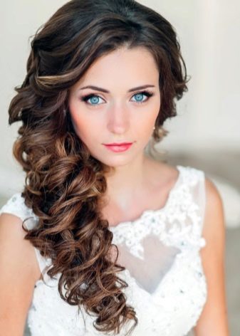 Since the curls in such hairstyles are thrown to one side chosen by the lady, an imitation of their spectacular density is involuntarily formed, in which it will be possible to seamlessly hide almost any fasteners - invisible or hairpins. Do not be afraid to hide these details behind your curls - the image will not become overloaded from this.
