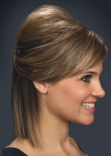 - First, the strands are pulled and placed over the forehead line. To this end, at the expense of two horizontally directed partings, the hair on the crown is separated. The closer the partitions are, the more visually the oval of the face stretches.