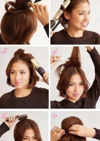 - the next step, the curls will need to be collected under the flagellum and fixed with an invisible one and at the end, the hair should be sprinkled with varnish.