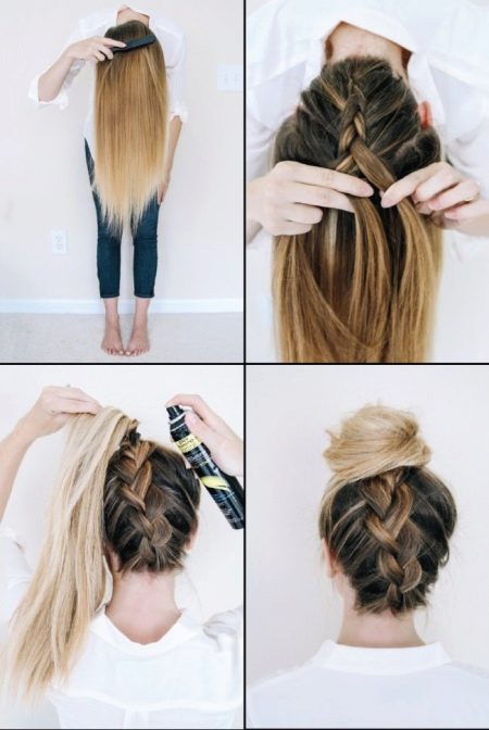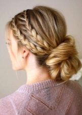 - Based on a French braid You can make many beautiful hairstyles for the holiday. Braid the braid from the lower border of hair growth towards the crown, weaving strands from the back of the head into it, then make a voluminous bundle of the rest of the hair on the crown. This option will not look very defiant, but it is very interesting. It is suitable for an official reception. But take care of the presence of an additional mirror, so that when you create such a hairstyle yourself, you can evaluate the result.