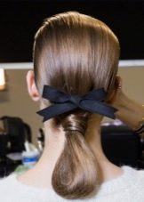 - Ponytail - A simple and quick way for long thick hair. It is also advisable that the lady's hair be straight. You just need to collect the hair on the back of the head, if desired, you can wrap the base of the tail with a strand. This hairstyle looks especially beautiful in combination with a bang, which can be either straight or asymmetrically laid.