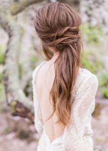 A simple and beautiful option are and loose curly hair. In this case, strands from the face are removed back and fastened with studs. This hairstyle looks natural and romantic, therefore, flower ornaments are the best suited for it.