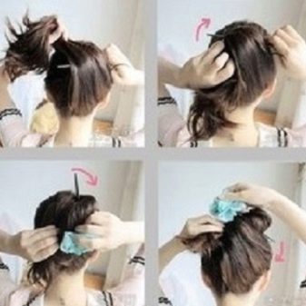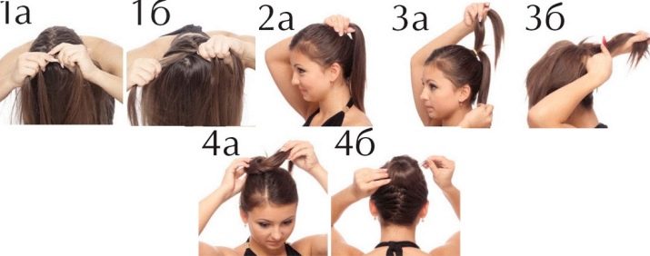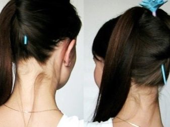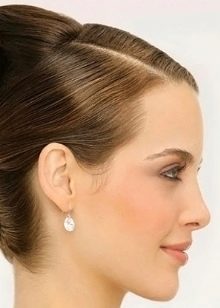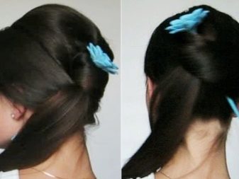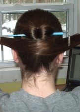 - All strands and bangs are collected in a ponytail on the back of the head, while maintaining a parting. On top of the gum (preferably a small one), it is stabbed with a hairpin.
