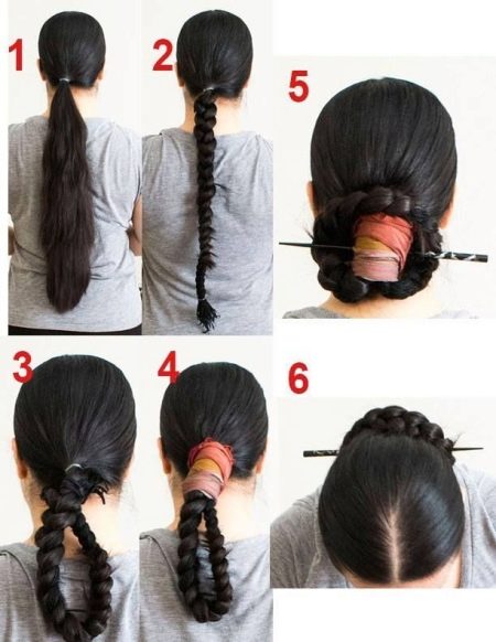 A casual hairstyle with a scarf and a Chinese hairpin.This hairstyle is simple in execution, reliable and unusual. A scarf can be completely replaced with a tape, with its subsequent weaving into a braid.