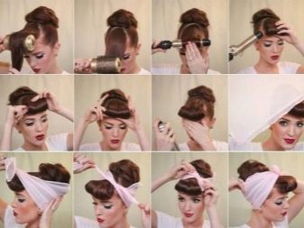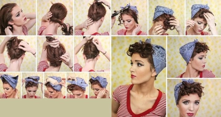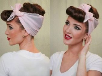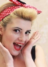 "Corolla of the World" is another stylish version of a pin-up hairstyle, which is appropriate in the afternoon, evening, on the beach, and in the city. To create a styling, a wide lock of hair is separated from the face (like a bang), and the rest of the hair is twisted into a voluminous bundle. A large curl is formed from a lock on the forehead using curling tongs and carefully secured with invisibility and varnish. If you have a bang, then the semblance of a curl needs to be made from it. After that, the nape is closed with a scarf, which is tied with a beautiful knot on the forehead - between the bundle and the bangs.