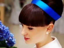 Medium length hair can be placed in a “babette”, decorated with a beautiful silk ribbon, or in a spectacular “high flight”. This styling looks most beautiful on the average length. It is done in this way: a pile is formed on the top of the head and is fixed with studs, invisible and varnish. The strands around the face are fixed back under the “babette”, and curled on the back of the head with forceps into large curls. It is also desirable to fix them with varnish.
