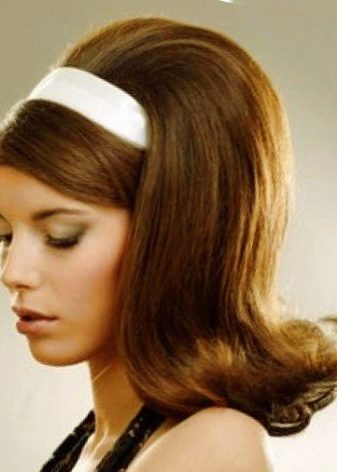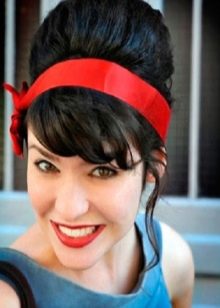 The tape can be tied with a knot up, creating a semblance of a turban. This styling is suitable for haircuts with bangs, and without it. Instead of a tape, you can use a scarf, then the hair on the back of the head will completely hide under it. The strands on the top of the head need to be combed and fixed so that they look voluminous. The crown area is separated from the bangs with a horizontal parting. If the haircut does not imply the possibility of wrapping the crown of strands on curlers or tongs, a pile will come to the rescue.