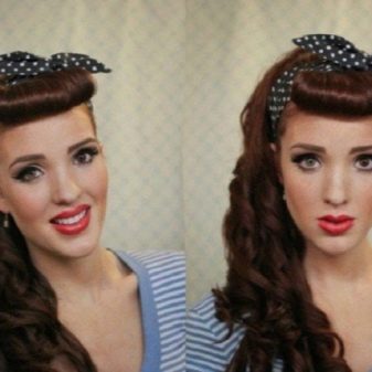 A “fluffy tail” of long strands will look very impressive if it is curled into tight, large curls that are well fixed with varnish. The hairstyle can be decorated with a bright scarf or ribbon. If you have the knack of long hair, you can build beautiful Victory Rolls. Having wrapped the remaining strands on the tongs and creating curls, the rollers are separated from them by a scarf or tape.