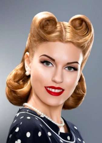 If the hair is longer than the shoulder blades, Victory Rolls can be laid not forward, on the forehead, but twisted like horns back. Hair is divided into parting (most often not perfectly symmetrical), a “horn” is formed from each half. At the same time, the hair on the top and back of the head can be left loose, curling into tight curls, or can be collected in a bun or shell.