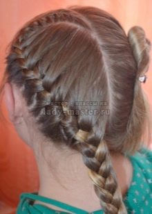 - Next, we dissolve our gulka, which was left on the top of the head, and weave from it an even "French" braid towards the occipital part of the head. When weaving reaches the back of the head, you can collect all the hair either in a bump, or in a single braid, or in a low tail.