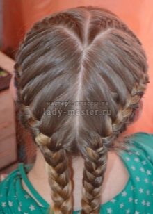 Weave it until all the hair from the selected part of the head is woven into a braid. We tie it with an elastic band. And using the same technology, weave a braid from another tail. Take two halves and tie them. It turns out a beautiful openwork "heart".