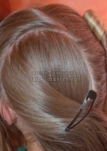 - At the top, with the help of a hairbrush, “tail” as if “draw” a small “heart”. We twist the strand, which turned out in the center, into a small row and fix it with any clamp - then we will have to dissolve it, so it doesn’t matter what you fix it with.