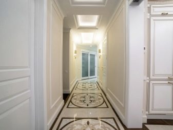 If you prefer wallpaper, then choose a floral ornament, large and discreet. A note of originality will make panels of glass or mirrors. The most budgetary wall decoration is painting. This will require additional decoration in the form of snow-white moldings and pilasters.The ceiling can be painted or ordered from specialists its stretch option. Choose a glossy surface with low ceilings in the hallway. A decorative frieze along its perimeter will look spectacular. The canvas with a pattern imitating an old picture is not forbidden.