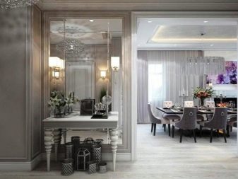 Furniture can be very elegant: unusual shape, with a glossy surface. Since the style involves the use of symmetry, the same floor lamps are placed on the table on both sides of the mirror. Such a hall is filled with brilliance.