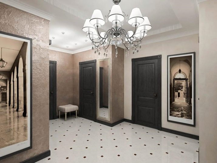 In a large entrance hall it will be appropriate to arrange large floor vases. The interior is enlivened by flowers, paintings. If the hallway area allows, then a false fireplace is placed in it. As its facing marble tile is used. The portal is designed with restraint. On the mantelpiece there is a place for candlesticks, figurines.
