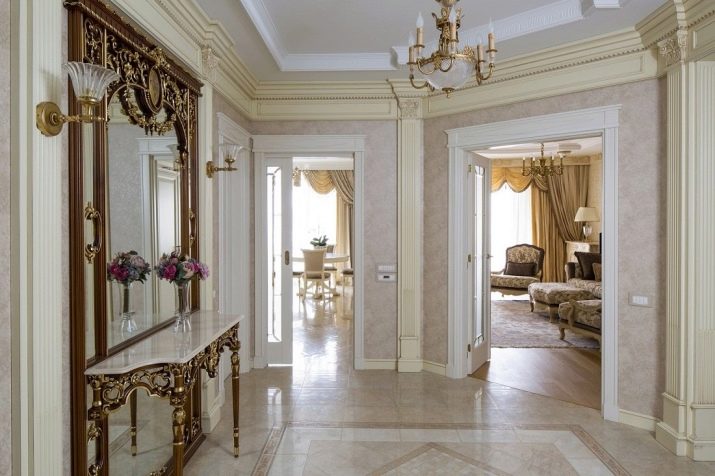 The mirror in the corridor can be very large, and its frame is simply huge. Gilded and carved, it looks incredibly luxurious and rich, in harmony with the surrounding interior items.