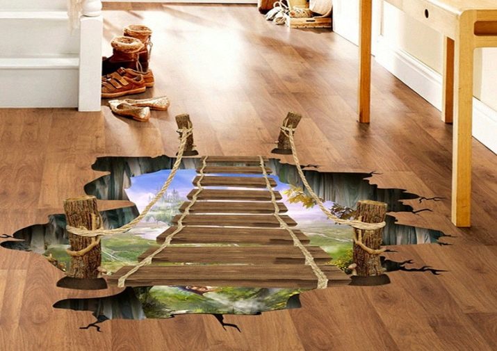An amazing coating that can use any kind of art print. Particularly impressive are 3-D patterns, which realistically depict the abyss under your feet, the river, green grass and other spectacular images. The picture is under a thick layer of polymer, therefore It does not wear out and does not fade. The coating itself is very dense, do not push it with a shoe pin and do not scratch the furniture.
