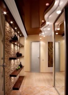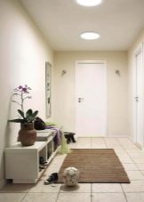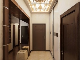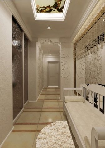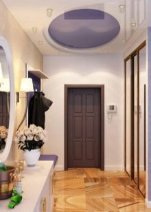 A suspended or suspended ceiling is best suited for a narrow entrance hall. In some cases, a multi-level design is used. It looks interesting design polystyrene foam tiles, stucco molding. The easiest option is painting with water-based paint.