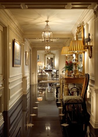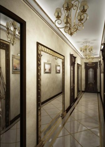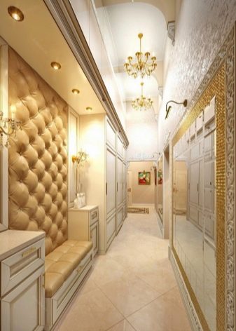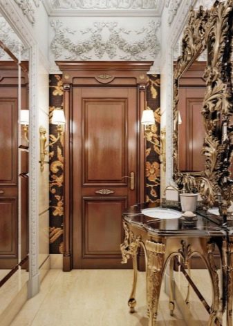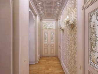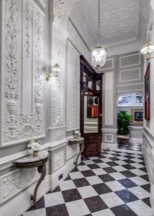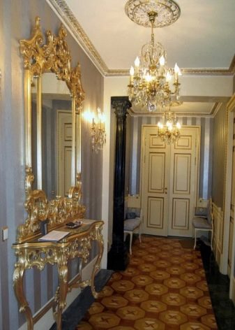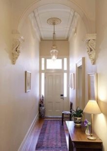 The classic interior will not be appropriate in the narrow hallway, because stucco and carved elements clutter up the space. You can implement antique motifs in the Greek style. Luxury baroque will have to be abandoned in favor of a usable area.