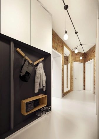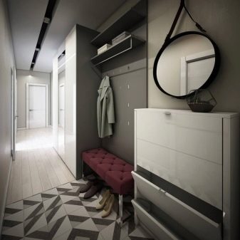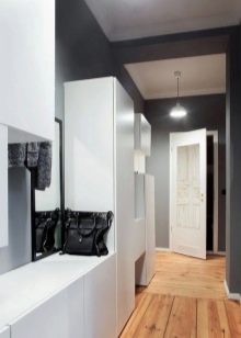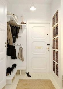 To accommodate all this abundance You can use open furniture for the entrance hall with several hooks, shelves and drawers. For a family it is worth choosing a narrow wardrobe. Ideally, if you can make a small niche in the wall to hide furniture at least partially.A sliding wardrobe with a shallow depth looks interesting. Length provides additional storage space.
