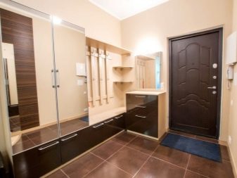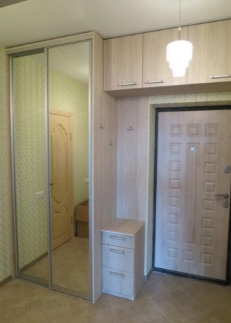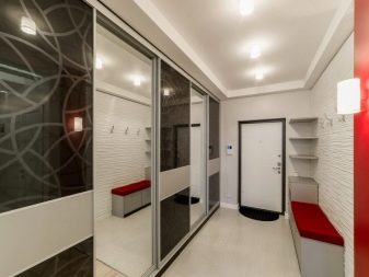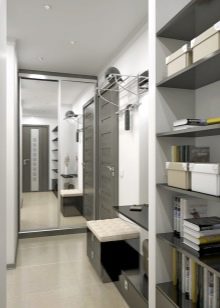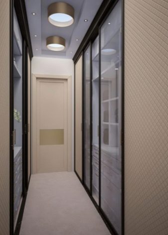 The cabinet can only be placed along one wall. Otherwise, the hallway will have nowhere to go. Sliding doors with mirrored or glass inserts will allow you to slightly hide the bulk of the furniture. In shallow cabinets it is much more convenient to use extendable end rods. Clothing will not be located sideways, but facing the facade.