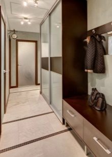 It is possible to furnish a hall minimal amount of furniture. It is enough only benches for seating, under which boxes or shelves with shoes are hidden. The wardrobe for outerwear in this case is located in some of the rooms. Actual solution for the release of a narrow entrance hall in a large apartment.