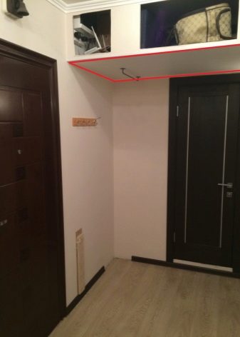 The mezzanine should be positioned so that the highest member of the family does not bang his head. Several boxes nearby will hide a large number of things. Then there will be enough a pair of hooks for clothes that are worn in a particular season. For storing shoes should provide a separate box.