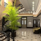 - Stylish lobby in a classic style. Hanging baskets and cozy couches, wall decor in the framework harmoniously fit into the interior. White wardrobe and doors in harmony with the natural colors of the walls and floor.