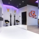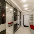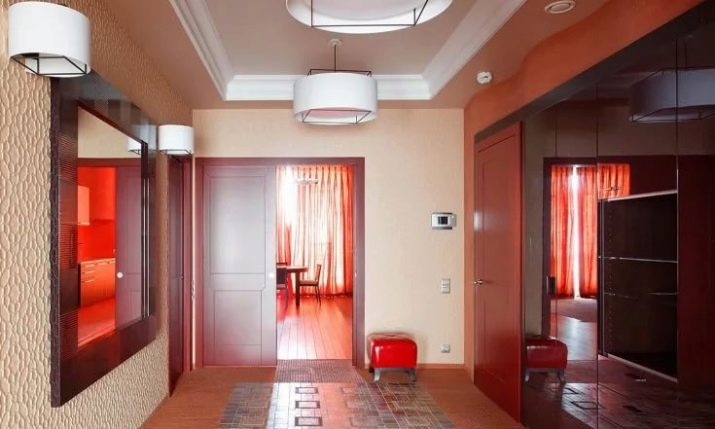 - Stylish lobby in a modern style. The mirror throughout the wall creates an optical illusion of space. The discreet colors of the walls are shaded by brighter decoration elements and colorful details in the form of a puff of a juicy tomato shade, unusual chandeliers.