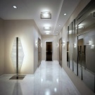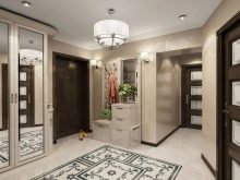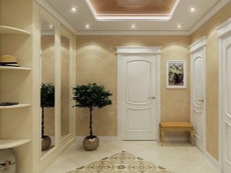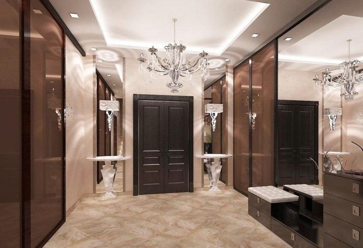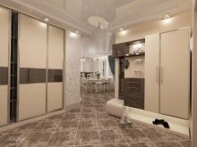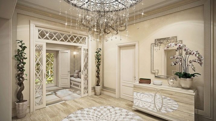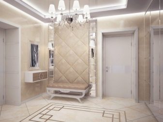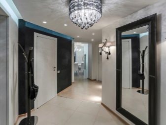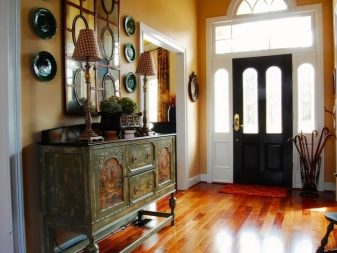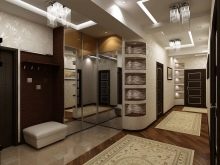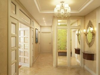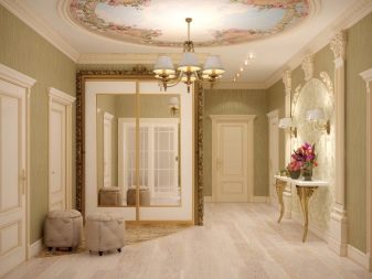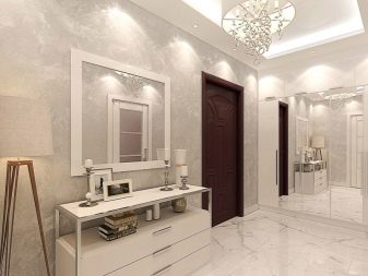 The interior of the hall in typical housing usually looks quite modest and concise. Limited area, ceiling heights of less than 3 m require the use of visual effects that can provide visual expansion of the space. As a decorative technique, it will be appropriate to use mirrors, glass or glossy light surfaces. The furniture is located mainly along the walls, has a reduced size.