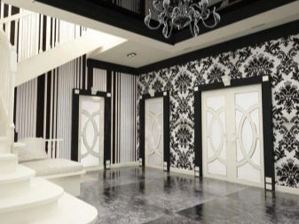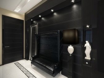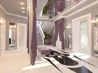 If the interior of the house has bright color accents, they should be added to the atmosphere of the hall as a connecting element. With light walls, it is worth using a contrasting dark floor. In a country house, the pastel color scheme in Provencal style looks stylish - white-blue, soft pink, lavender, mint, milky shades fill the interior with cosiness. The spacious lounge in the apartment looks impressive in a glossy black and white design.