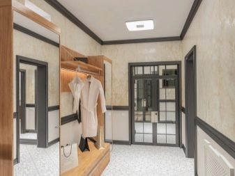 The long and narrowed entrance zone can be divided into several functional sectors - a place for changing clothes, a storage unit and, for example, a horizontal bar.