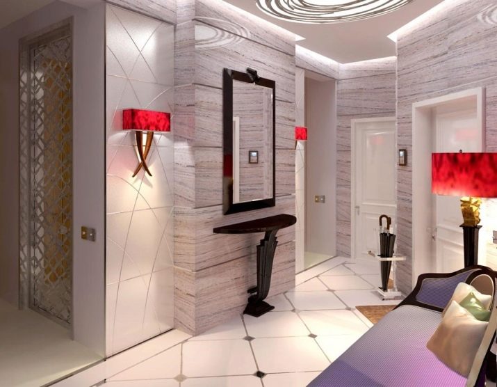 - Art Deco - this style involves the use of expensive materials in the lining, it is characterized by the predominance of a monochrome palette with contrasting accents. Geometric patterns, expensive stucco molding and glossy facades are also welcome. Indoors, a mirror in an intricate frame, a sconce with forged decor, figurines, panels, vintage vases or ethnic elements become an obligatory attribute.