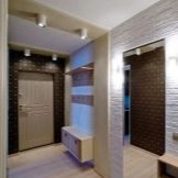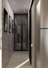 Brickwork on the walls will also help to make the interior of the narrow corridor brighter. In the case when the cabinet is installed along the end wall, you should try to leave space for the rest of the furniture (small shoe rack and wall hanger). It is not recommended to hang mirrors on the end wall, this can visually make the corridor longer.