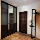 Often in miniature corridors "Khrushchev" set built-in wardrobe. It is a practical and multifunctional element. Sliding doors of the structure during opening take up little space, which is ideal for narrow and elongated rooms. A large cabinet is recommended to be installed in a niche, due to this there will be an additional opportunity to place a hanger-rack near the doors or hang hooks for clothes on the wall. If the space of the room allows, then you can also put small ottoman and shoe rack.