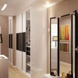 In this case, the wardrobe is best installed along the aisle, and not near the far wall. Its model should be chosen so that after its placement there is free space for movement. Since the closet will be the largest item in the interior, it is impossible for all attention to be focused only on it. To do this, decorate the wall opposite the cabinet. Great for this canvases with landscapes or 3D wallpaperswhich will be originally combined with a mirror surface of furniture.