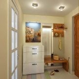 In addition, small corridors in the five-story building should be equipped with built-in furniture. It has small dimensions and, due to the lack of walls, takes up a minimum of space. An obligatory piece of furniture in these hallways is a shoe rack, which allows you to free up space and hide shoes from prying eyes.