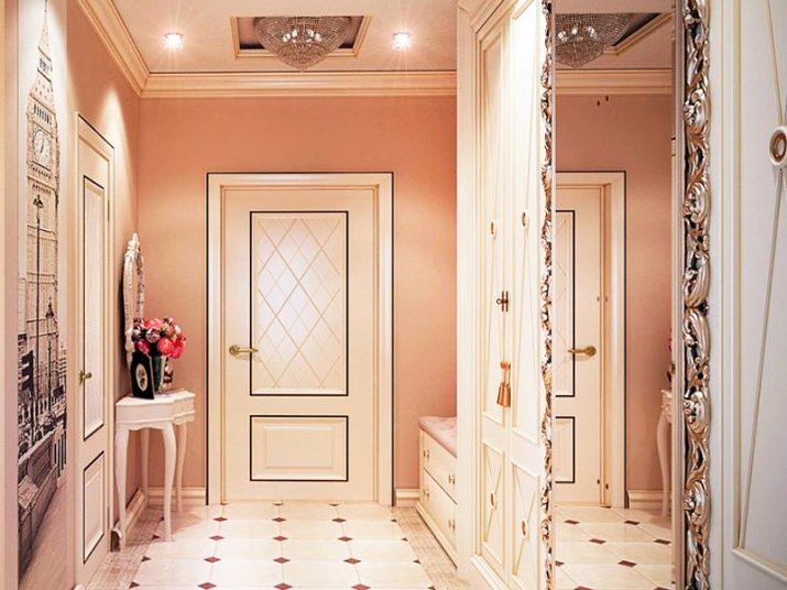- Classic style corridor. This option is usually chosen by calm people who value rigor in everything. This style looks good in rectangular and square rooms that need to be filled with symmetry, geometric shapes and clear lines. Surface finishing should be done in neutral shades, using only natural materials. The hallway must be furnished with gilded or bronze elements, and for lighting, choose a sconce and a chandelier, which can be replaced with small spotlights.