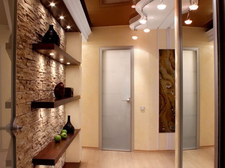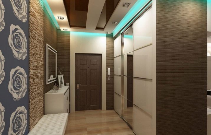 The main rule when creating an interior in tiny hallways is use of light, so without installing fixtures on the ceiling can not do. It is best that they are located around the entire perimeter of the ceiling. Overhead lighting can also be added using sconces. If there is a mirror in the corridor, then one of the lamps should be hung opposite, and the other above it. In narrow and long hallways, you should try to make lighting in such a way so that the light is not directed to the center of the ceiling, but to the walls (vice versa in low rooms).