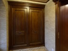 - Wood. Natural wood is also actively used in the manufacture of furniture, including built-in wardrobes. Such designs are environmentally friendly, durable and able to maintain appearance for more than a dozen years. For the manufacture of built-in cabinets, most often either wooden lining (or a thin covering board) or a planed board is used. Despite the advantages described, natural wood furniture has its drawbacks: increased weight, as well as low resistance to high humidity.
