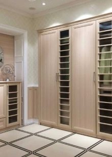 - Lower zone. It is located at the level of the ankles and is presented in the form of long and low shelves with several levels of sections of different sizes. Inside these sections, shoes are stored for different seasons or for different family members. In cheaper versions of built-in wardrobes for the hallway, shoes are not stored in special sections or shelves, but simply placed on the floor.