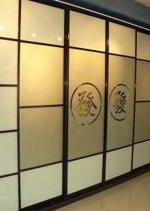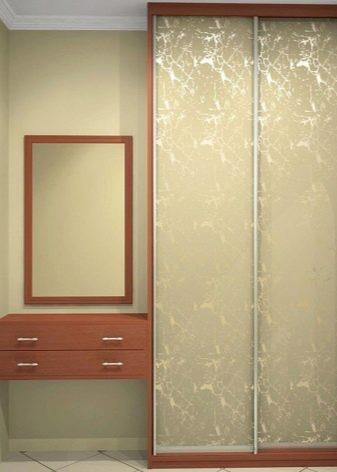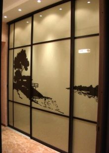 - Photofacade. This is a popular option among owners of built-in cabinets with glass cladding. In this case, a film with some pattern is placed on the glass (most often these are flowers or abstract patterns). On top of the film, the facade is varnished to fix the result and prevent damage to the film.
