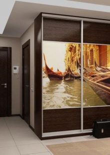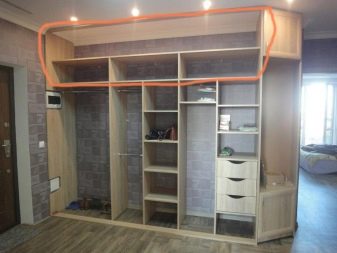 - Built around the front door. Not a very popular, but very functional and compact type of cabinet for those who want to make the most of all the space in their apartment. This variety forms a kind of arched or U-shaped design around the front door. Clothes are stored in the side compartments, shoes in the lower compartments, and the upper ones serve as mezzanines.
