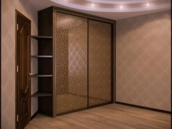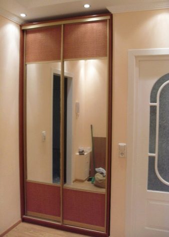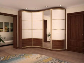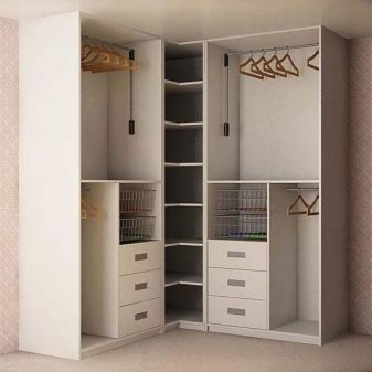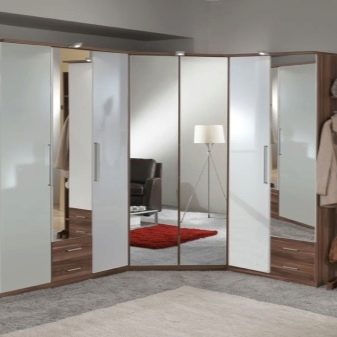 - Corner option. By design, it can be either purely built-in, or with walls and ceiling. Unlike the options located above, this design allows you to take up less space, but at the same time it is not inferior to spaciousness as standard equipment. As a rule, the front or front of the cabinet is located at a wide angle for a soft transition to the walls of the room.