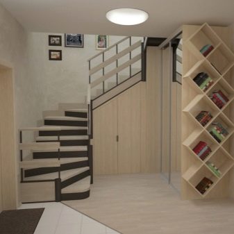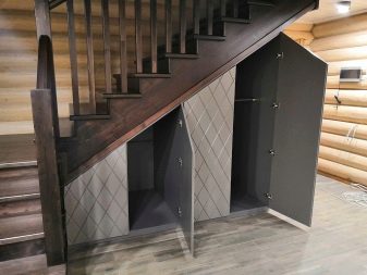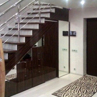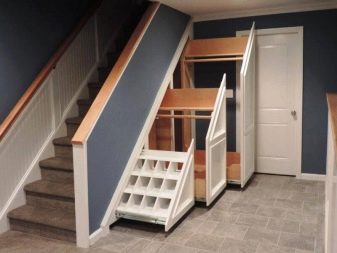 - Built under the stairs. This option is used exclusively in private homes and is designed to maximize the use of free space. In this case, the dimensions and shapes of the cabinet completely repeat the angle and height of the stairs. Most often, it is the sliding options of shelves or cabinet with open shelves and rear wall (like a shelving) that are used.