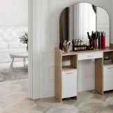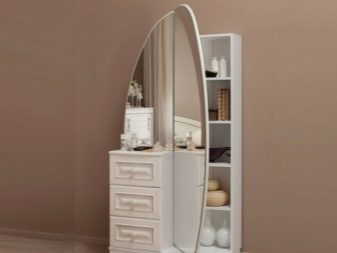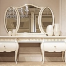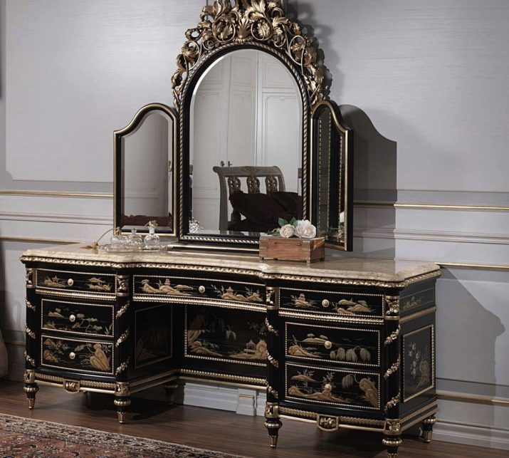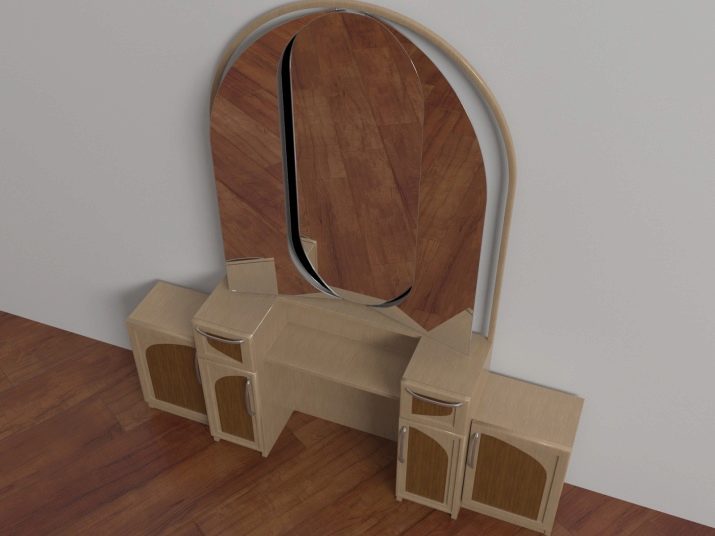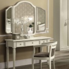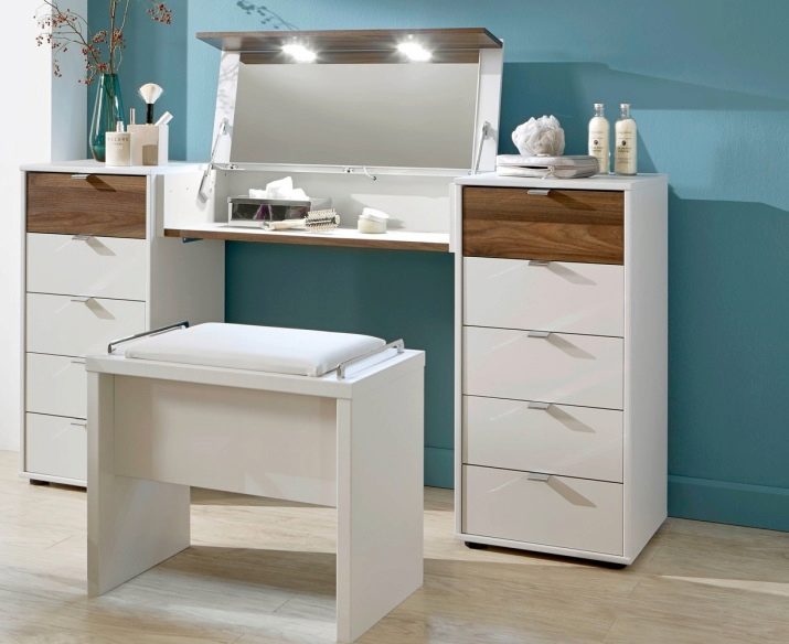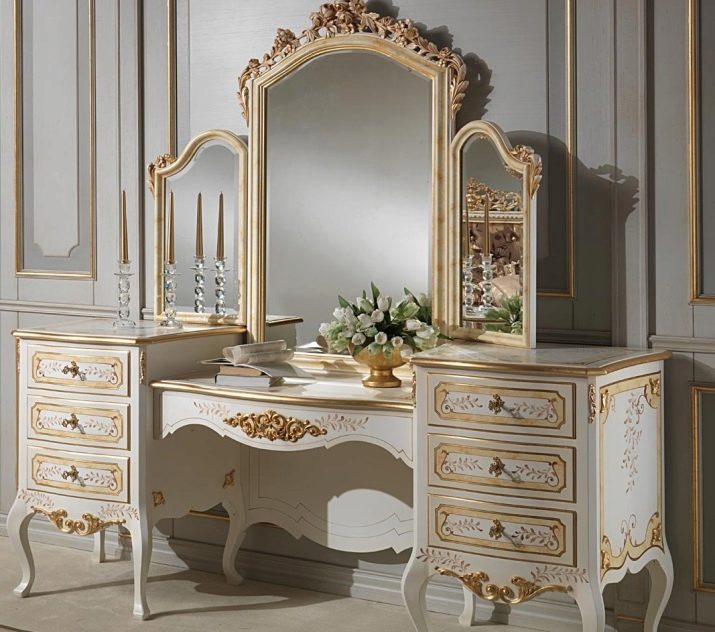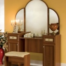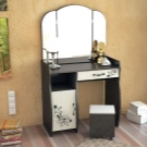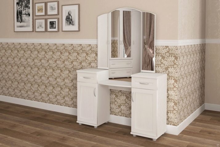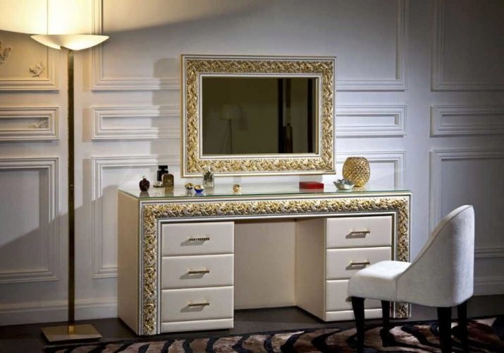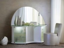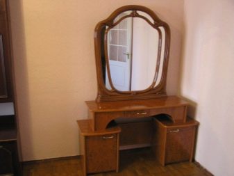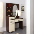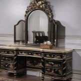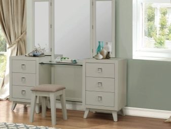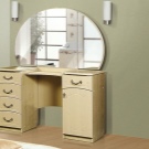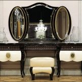 The dressing table is a small table with a mirror cloth fixed on it. As a rule, it is equipped with shelves on the sides and several drawers for storing small items. It can be issued in the form of dressing secretaries, in this version the mirror is mounted on a hinged lid - if you want to look at yourself, just open it, and when closed, the table can be used as a desktop.