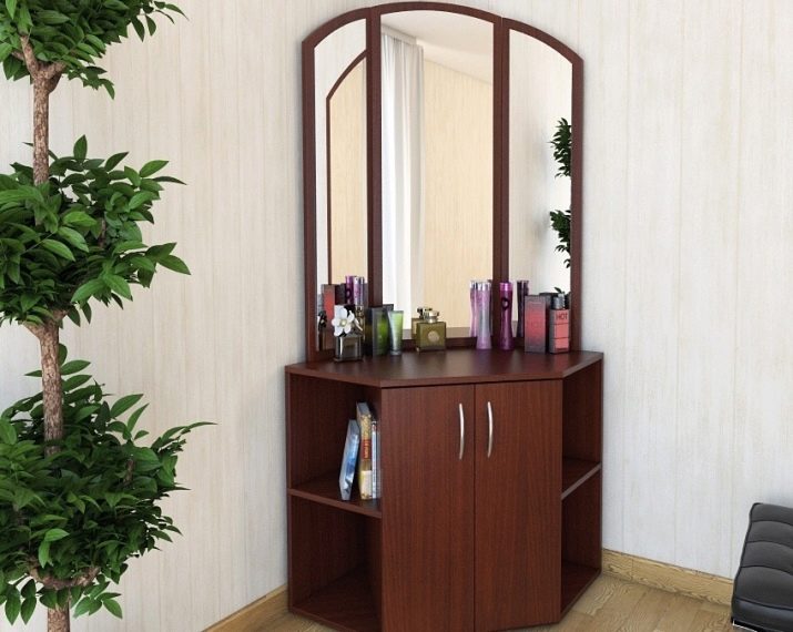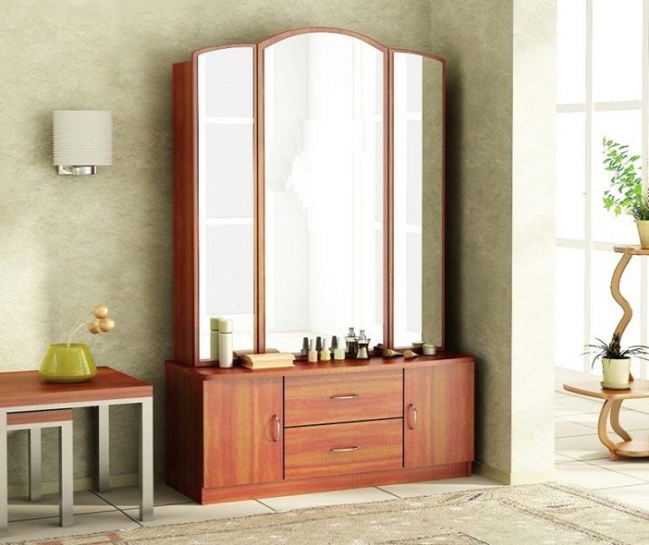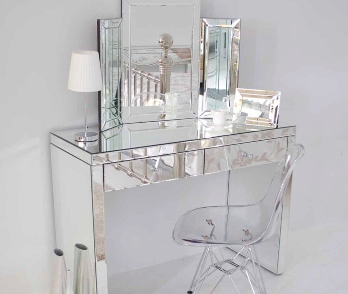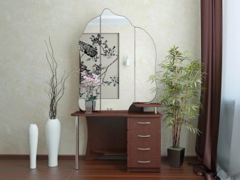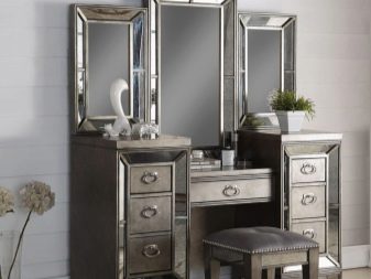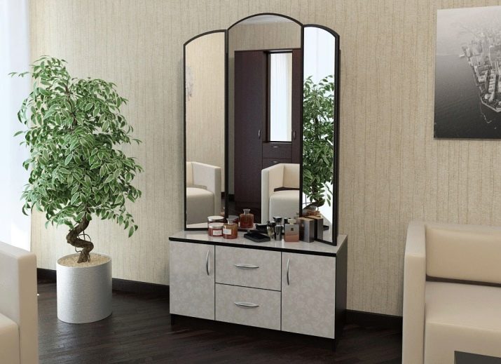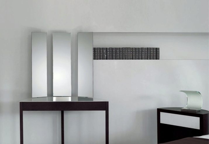 The trellis consists of three mirrors on a bedside table or a low table - as a rule, the main canvas is fixed in the center statically, and the narrower side are attached to the hinges, they can be moved, thereby increasing the viewing angle.