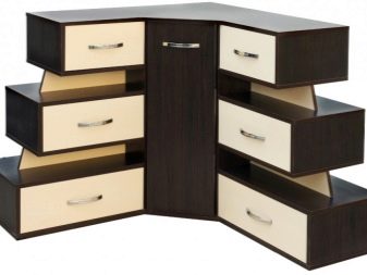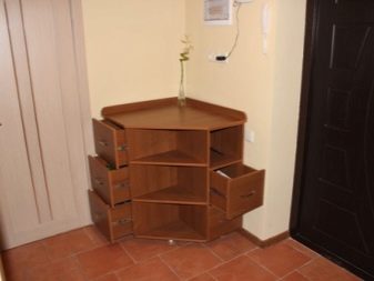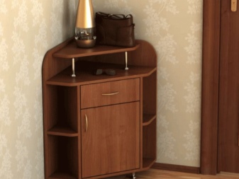 If it is not possible to place a regular rectangular model, perhaps you should choose an angular chest of drawers. Some models of such products can have only one door and can be designed as ottoman. The classic model of the corner chest of drawers has 2-3 shelves to store small items, and used as a stand for bags or umbrellas.