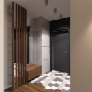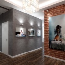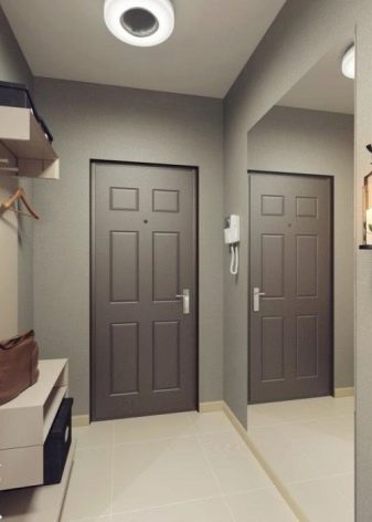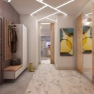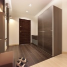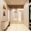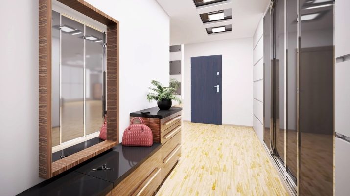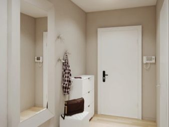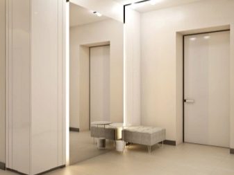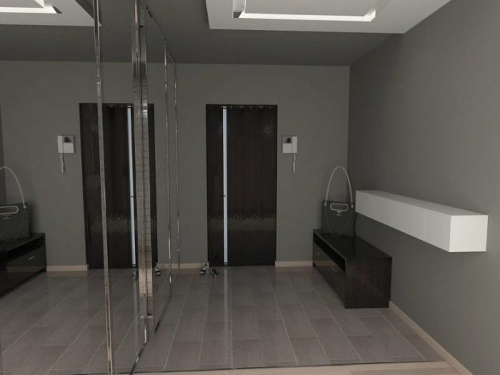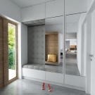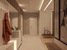 In mirrored cabinets along the entire wall everything will fit, while initially it seems that these are not cabinets at all. The entrance hall is not very bright, but the practicality of its design is at the highest level.
